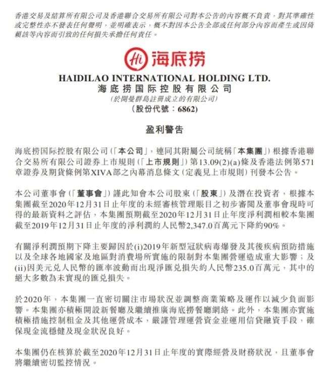 公告显示,根据海底捞截至2020年12月31日止年度的未经审核管理账目之初步审阅及董事会现时可得的最新资料之评估,海底捞预期截至2020年12月31日止年度净利润相较本集团截至2019年12月31日止年度的净利润约23.47亿元下降约90%。