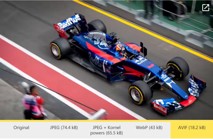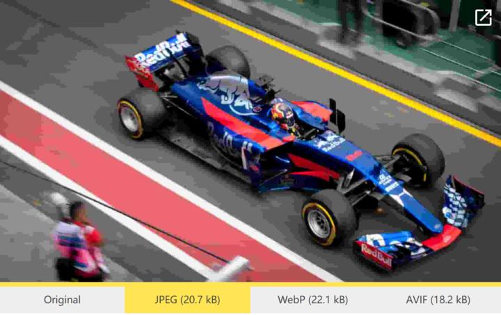 而当看到 18 KB 的 AVIF F1 赛车时,就像是近视眼带上了眼镜:平滑的赛道、色彩过渡自然的赛车、保留细节的头盔,更令人难以置信的是,这张清晰得多的 AVIF 图片,体积甚至要比 JPEG 还小。