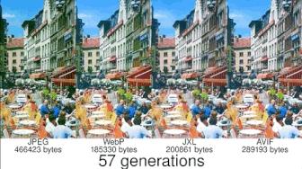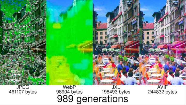 视频博主 Jon Sneyers 将一张 JPEG 图片与 AVIF 图片对比测试压缩 1000 次后的前后变化,从结果上看,JPEG 已经面目全非,而 AVIF 依然崭新,这又是一次属于 AVIF 的胜利。