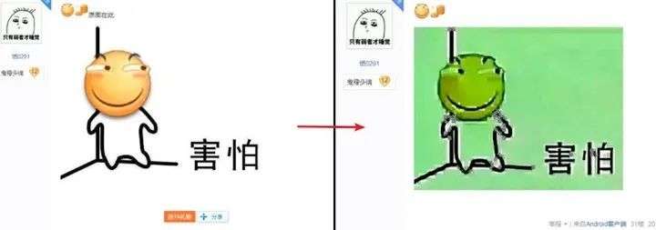 JPEG 除了压缩会导致画面细节丢失以外,色彩失真也是它被人诟病的一个点。例如早期表情包出现的「电子包浆」现象,就是因为表情包在用户之间传输时,不断被压缩产生的色彩失真(变绿包浆是因为 Android 7 之前压缩图片产生了 Bug)。