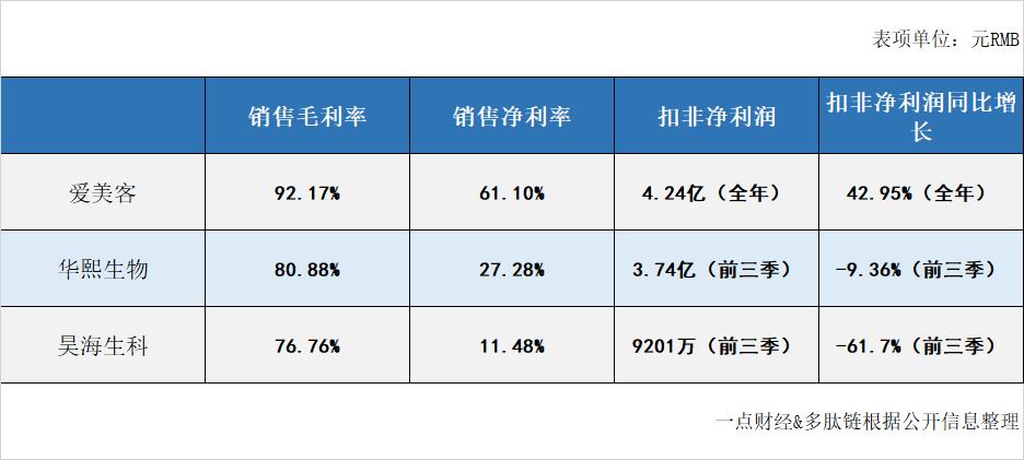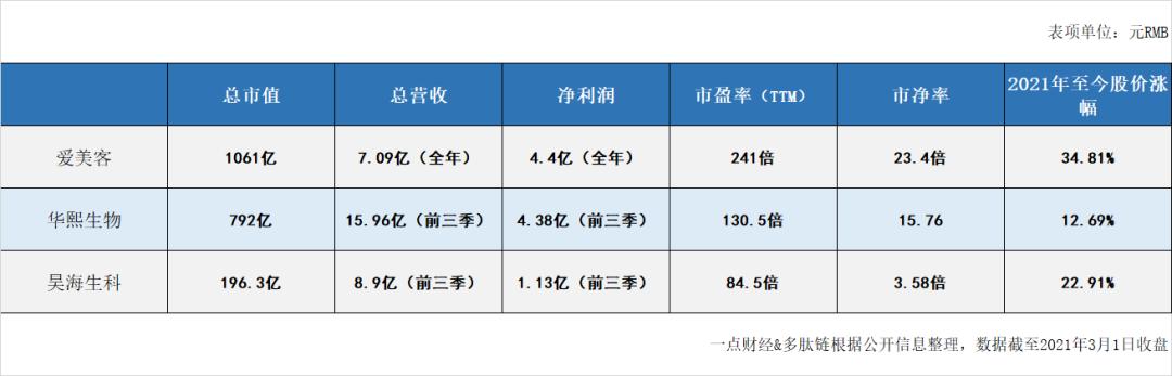 比较营业总收入,爱美客是三家公司中最低的;比较净利润,华熙生物前三季度就已接近爱美客全年净利润水平,但爱美客的总市值却是另两家同业之和。