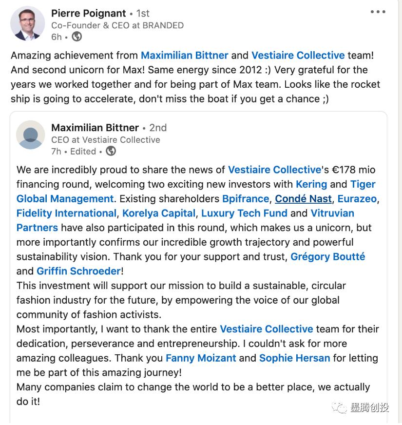 今天,早在2019年因为阿里高管空降而离开Lazada去做二手奢侈品电商平台的Max在LinkedIn宣布Vestiaire Collective完成了1.78亿欧元的融资,成功晋升为独角兽,新加入的投资者包括开云集团(Kering Group)和老虎全球管理基金(TigerGlobal Management)。