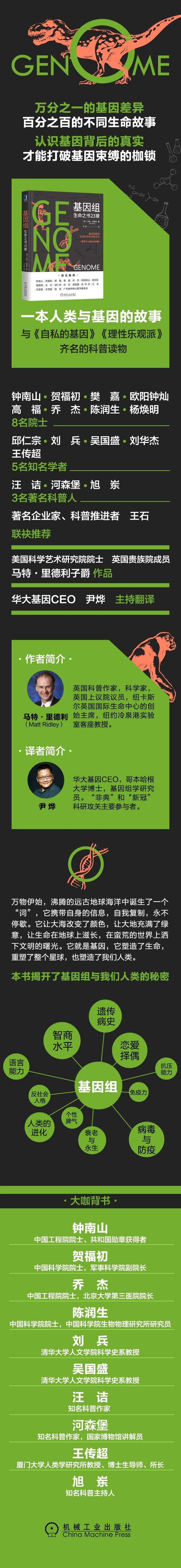 这本书英文原版作者马特·里德利既是一名动物学博士、纽约冷泉港实验室客座教授,也是著名的科普作家。在这本书里,他独辟蹊径,从23对染色体开始,介绍基因在人之所以为人的演化过程中所扮演的角色。在他看来,我们是基因制造的有智能行为的机器,演化是基因间的竞争。