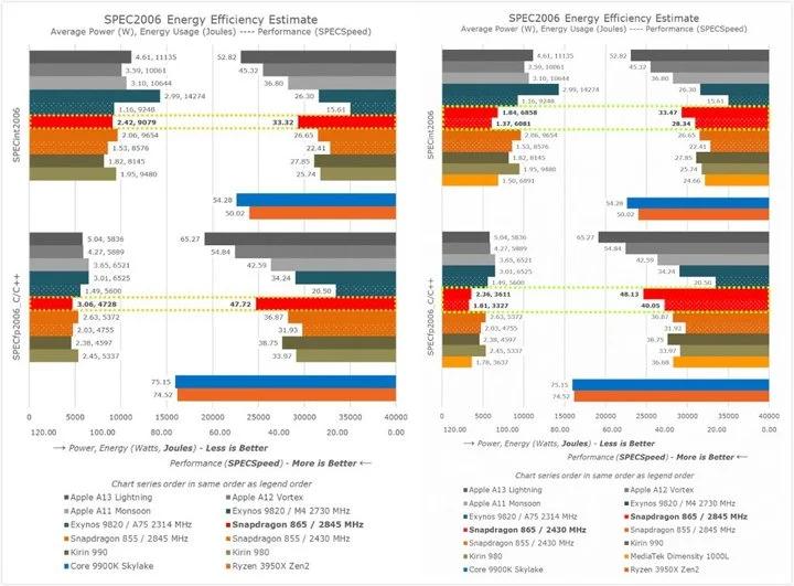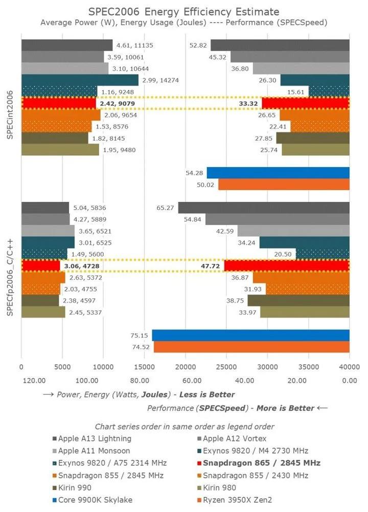 Anandtech 的这个排名只是基于测试得出的「平均功耗」参考数据,要得出 SoC 的总功耗还应该结合使用时间和其他综合因素。但能看到骁龙865的功耗比过去更低,其实我们也能了解到新处理器在「节能」这方面有着更出色的表现。