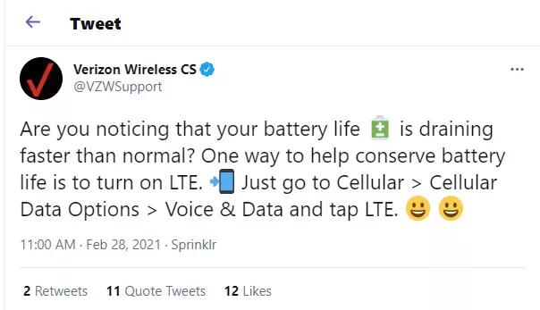 推文中表示,如果用户发现手机电量比正常情况下消耗得更快,可以打开手机LTE(Long Term Evolution)来减轻耗电情况。当然,开启LTE就意味着要关闭手机的5G网络功能,Verizon这样的说法总比直接告诉用户“关掉5G”来的委婉一些。