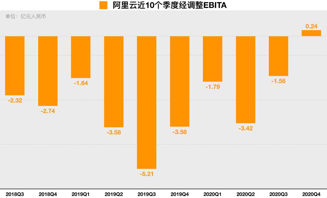 在2020年第四季度,阿里云终于“翻身”了。当季阿里云实现收入161.15亿元,经调整EBITA(息税折旧摊销前利润)2400万元,这是阿里云历史首次季度盈利。全 年阿里云经调整EBITA为-6.53亿元,相较于2019年的-13.99亿元大幅收窄。