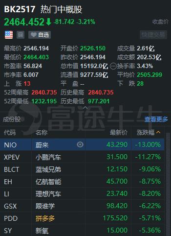 知名中概股中,阿里巴巴跌3.01%,京东跌1.67%,网易跌0.42%,百度涨2.15%,拼多多跌5.71%,蔚来汽车跌13%,理想汽车跌8.20%,小鹏汽车跌11.27%,哔哩哔哩跌4.65%,台积电跌2.42%,京东跌1.67%。