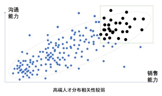 此时,样本分布上,沟通能力与销售能力的相关性,就几乎看不出来了。