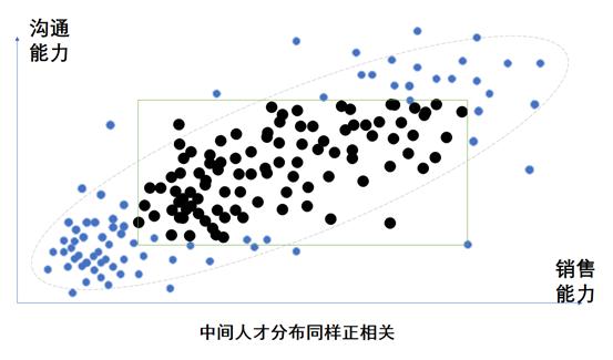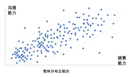 首先,我们必须承认,大部分行业中,沟通能力与销售人员的业绩一定是呈统计上的正向关系的。如果我们对所有人进行一个沟通能力与销售能力的统计,结果应该呈现下面的分布: