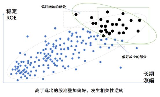 这样选出来的股池必然分布于右上角,本来相关性就弱,再叠加ROE偏好,剔除一些ROE不高的公司,并补入ROE不错,但其他方面弱一点的公司,最后的股池,往往是ROE与长期涨幅变成负相关。