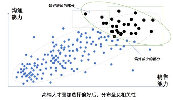 那为什么又变成负相关性了呢?这就跟招聘部门僵化地执行“沟通能力优先”的要求有关。