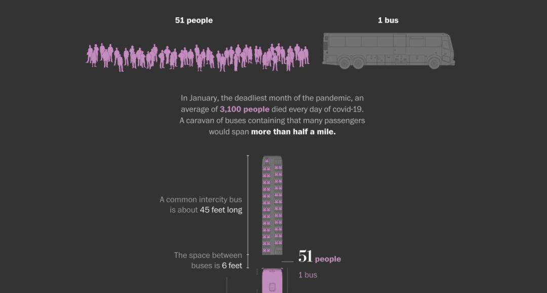 “想象这50万人都乘坐大巴车出行,一辆大巴车核载50人。在过去的一个月中,平均每天有3100人死亡,相当于乘载这些人的大巴车将延伸至半英里以上。如果让50万人都坐上这样的车,那么这条车队会延伸95英里,相当于从纽约到费城的距离。”