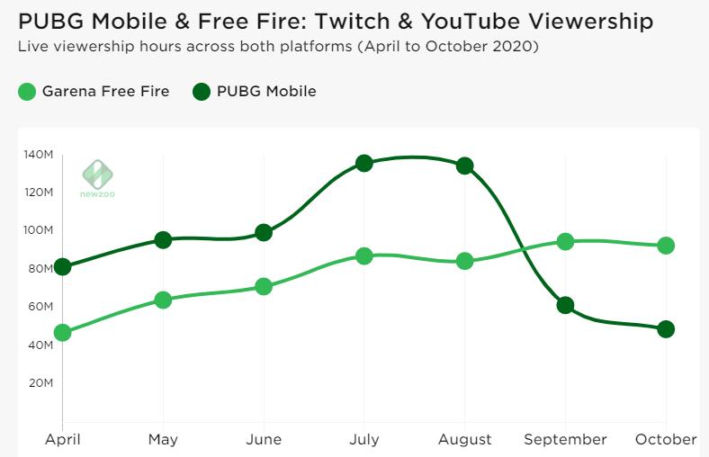 去年九月,印度政府宣布禁用 118 款中国 App,其中即包括腾讯旗下的《PUBG Mobile》,这无疑给同类型的其他大逃杀游戏创造了机会,最先受益的就是《Free Fire》。从9月禁令颁布以来,《Free Fire》在youtube和twitch的观看人数首次超过了《PUBG Mobile》