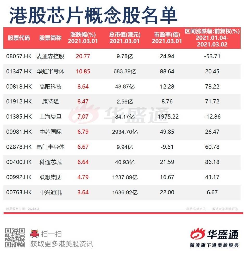 受上述消息影响,3月1日港股半导体概念大涨,华虹半导体(01347.HK)大涨10.85%,中芯国际(00981.HK)、上海复旦(01385.HK)涨近7%。
