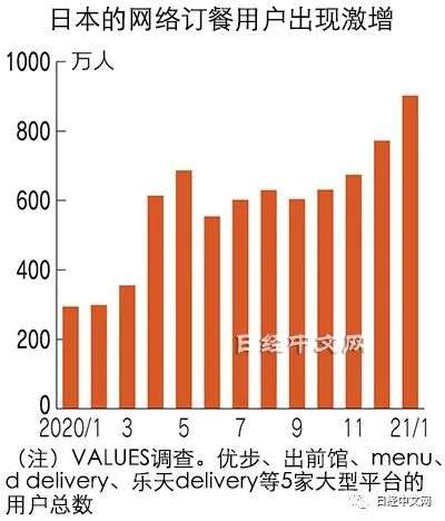 由于日本间断发布了紧急事态宣言等,外卖配送的需求正在增加。数据分析公司VALUES的统计显示,2020年1月仅为294万人的网上订餐用户到2021年1月增至902万人,膨胀至3倍。Uber Eats已进驻东京和大阪等33个都道府县,有望进一步扩大,将于年内在其它地区推出服务。