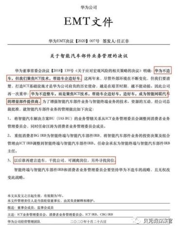 这一变化意即华为将会针对消费级市场涉足新能源及智能汽车领域。刹那间华为造车闹得沸沸扬扬,但是这时任正非签发的华为内部EMT文件给这一热点泼了一盆冷水。“以后谁再言造车。干扰公司,可调离岗位,另外寻找岗位。”