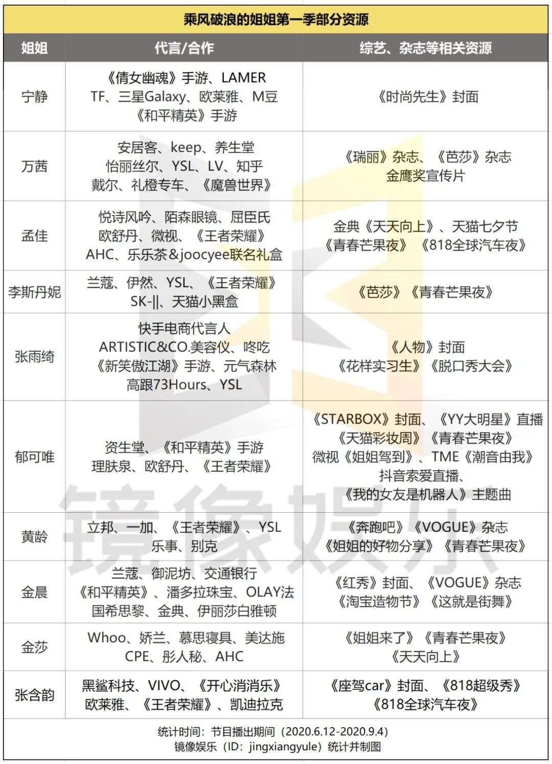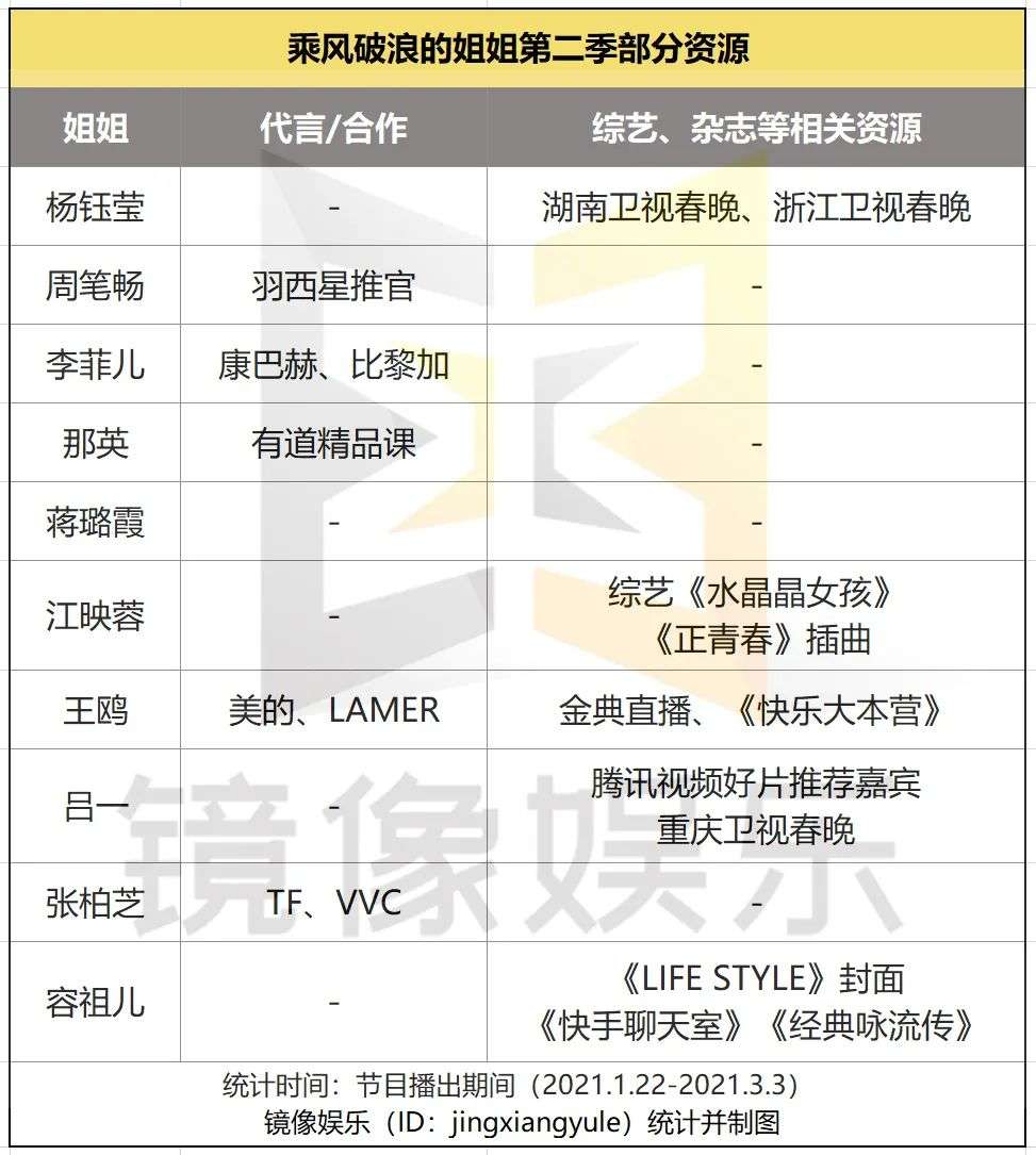 值得注意的是,品牌方除了与节目达成合作之外,凭借《浪姐1》声量渐起的姐姐们也拿到了非常多的合作资源。