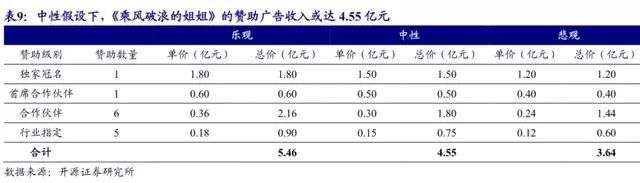 由此可见,《浪姐1》最初的广告合作并不抢手,很多品牌方都是在节目播出之后才开始寻求合作。然而,随着节目爆火,《浪姐1》的广告位一度到了“一票难求”的局面,据开源证券预测,在中性假设下,《浪姐1》的广告收入预计在4.55亿元。