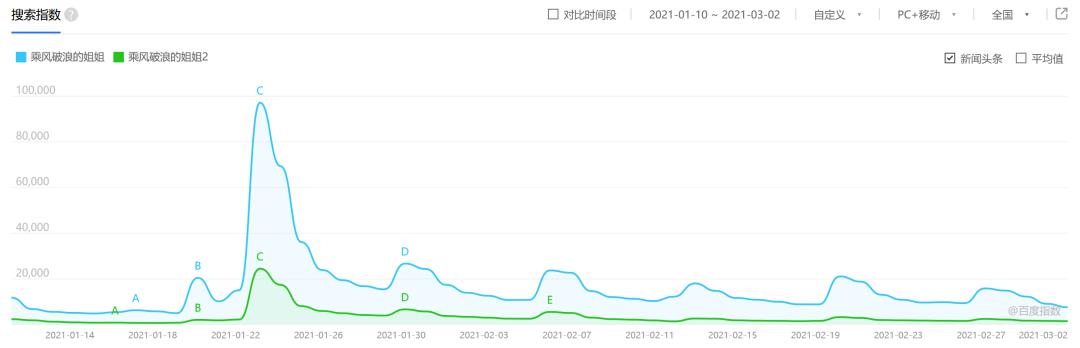 对比《浪姐1》播出期间的百度搜索指数来看,节目热度峰值一度逼近40万,且整体搜索指数在较长一段时间内都保持在10万以上,远高于《浪姐2》的整体表现。