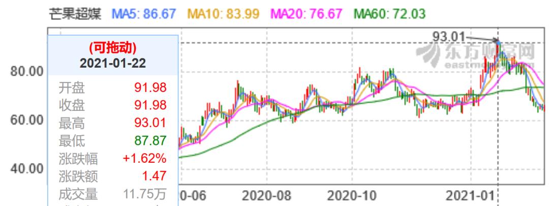 值得注意的是,这一趋势一直延续到《浪姐2》开播。1月22日,也就是《浪姐2》开播当天,芒果超媒的股价峰值达到93.01元/股。然而,也是从这一天开始,公司股价连续多日暴跌,截至今日收盘,芒果超媒的市值已蒸发480多亿。