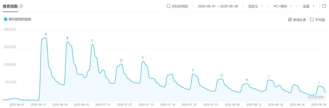 而在《浪姐2》播出期间,根据百度搜索指数,节目的热度峰值出现在首播当天,之后便经历了一个大幅度的回落,整体保持在2万-4万之间。