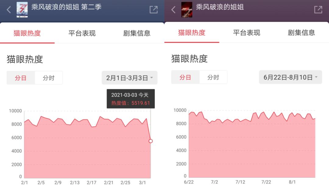 在网端,猫眼数据显示,《浪姐2》播出至今,除了在上线第二日登顶全网综艺热度板块之外,之后的热度值整体在9000上下。而《浪姐1》播出期间,则累计拿到11次综艺热度日冠,节目热度值也屡屡逼近10000。