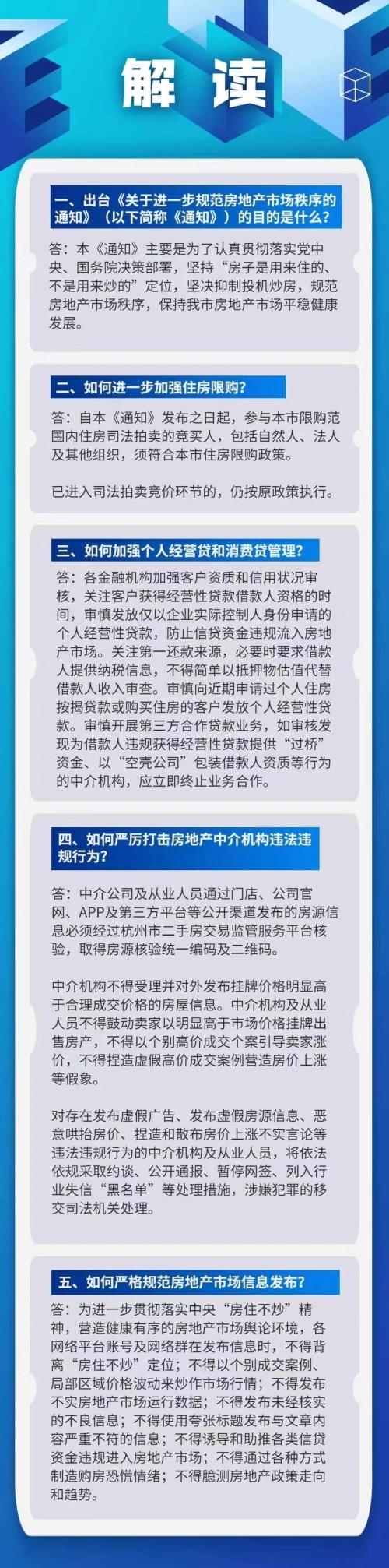 《通知》明确严格规范全市房地产市场信息发布。各网络平台账号及网络群要严格遵守相关法律法规和管理规定,进一步规范信息发布行为,加强发布内容的合法性、真实性、导向性,共同为杭州房地产市场健康稳定发展营造良好的舆论环境。对不实传播杭州房地产市场政策和市场运行情况、制造虚假热销、助推投机炒房等扰乱市场秩序的违法违规有害信息,相关部门将依法依规严肃查处。