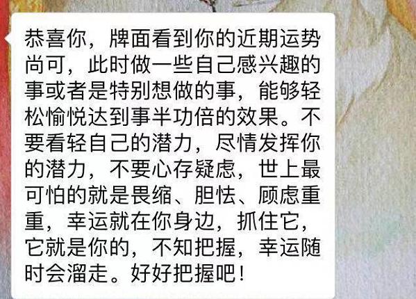 “同学介绍我加了一个免费算塔罗牌的人,说很准而且她确实没花钱。我想既然是免费的,就试试看呗。”张文加了占卜师好友并说明来意,对方很快发来一段录像,告诉她已经洗好牌,请她选出三张牌后向她解释每张牌的寓意及昭示的未来。