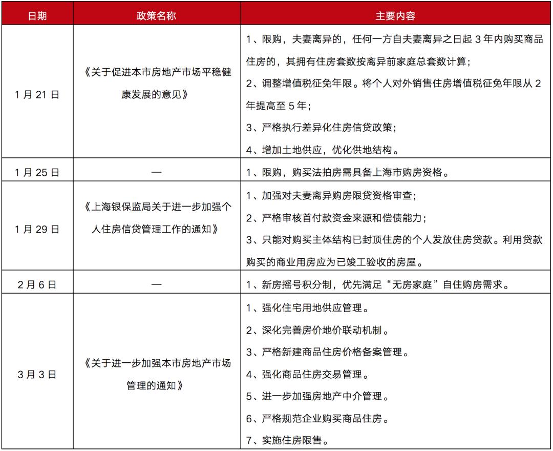自 1 月 21 日“沪十条”拉开上海新一轮楼市调控的大幕,“假离婚”购房漏洞被堵, 25 日,法拍房纳入限购范围,随后,春节假期期间,上海对新开盘项目实行积分摇号制度等,一系列政策内容旨在保障无房家庭购房权益,打压市场投资炒作氛围。