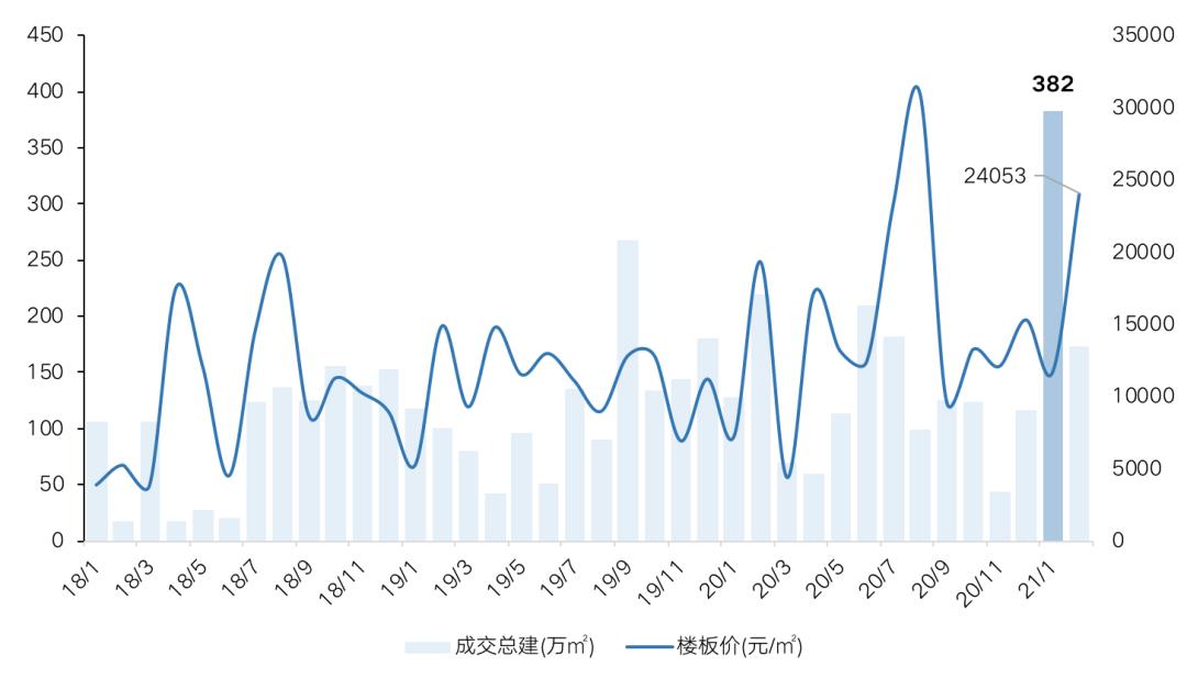 据CRIC监测,2021年前2月上海涉宅用地成交量“井喷”,累计同比大幅增长60%,1月成交建筑面积达382万平方米,创近4年新高。价格层面,2月末成交楼面价飙升至24053元/平方米,达阶段性高点。