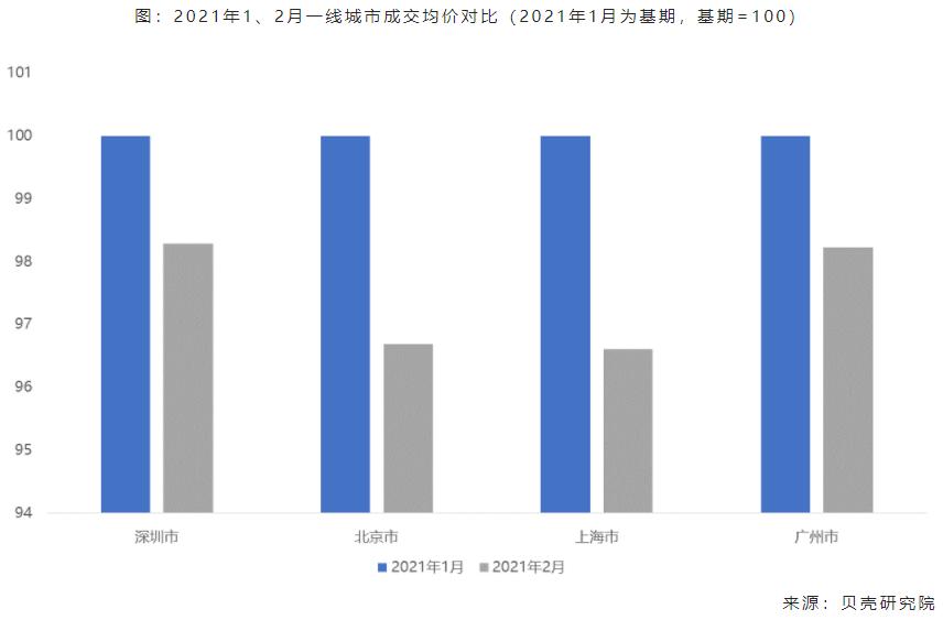 一线城市2月成交均价高位回落。从实际成交数据看,2月北京、上海环比下跌幅度超过3%,广州、深圳二手房成交均价环比下降约1.7%。