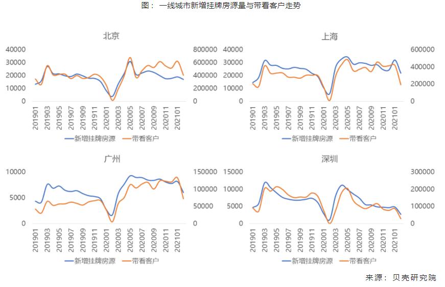 从供需层面看,2月北京、上海、广州新增挂牌量、带看客户均处相对高位,供应与需求均活跃。深圳新增挂牌、带看客户量呈持续下行趋势。