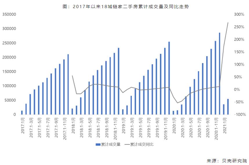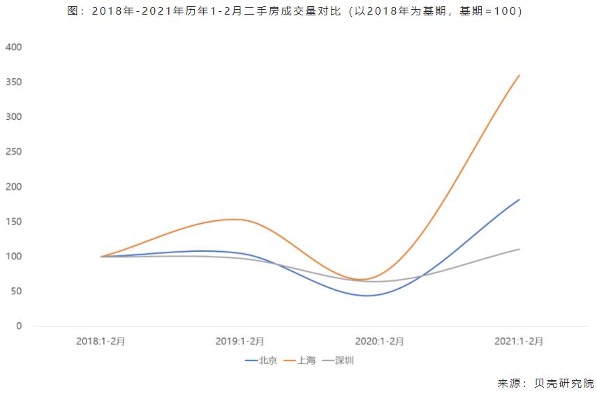 调控收紧预期下,市场需求加速释放,2021年以来重点城市成交量保持增长。贝壳研究院数据显示,1-2月重点18城[1]链家二手房成交套数较2019年同期增长约70%,超过去年同期的3.5倍,其中一线城市二手房成交量较2018年以来历史同期显著增长。二手房成交量的增长主要由两方面因素影响,一方面,1月下旬以来调控收紧政策密集出台,特别是一线城市加强金融管控,如北京、广州、上海等严查经营贷资金,深圳公布3595个住宅小区二手房成交参考价格并要求银行作为按揭贷款发放的评估依据,调控氛围紧张;此外市场预期3月即将召开的全国两会可能带来调控政策进一步收紧,部分购房需求赶在全国两会召开前的窗口期加快入市。另一方面,今年春节“就地过年”也利于购房需求入市。