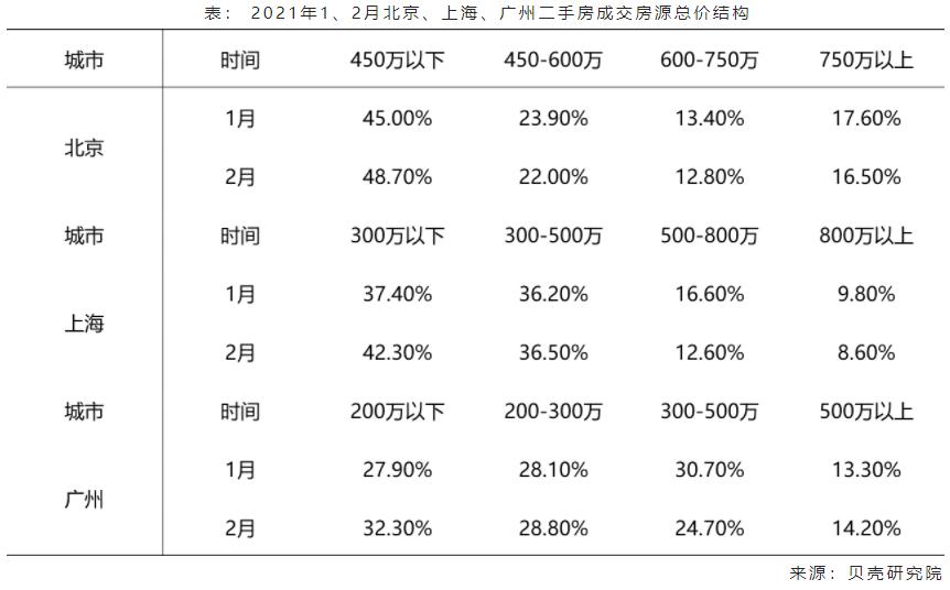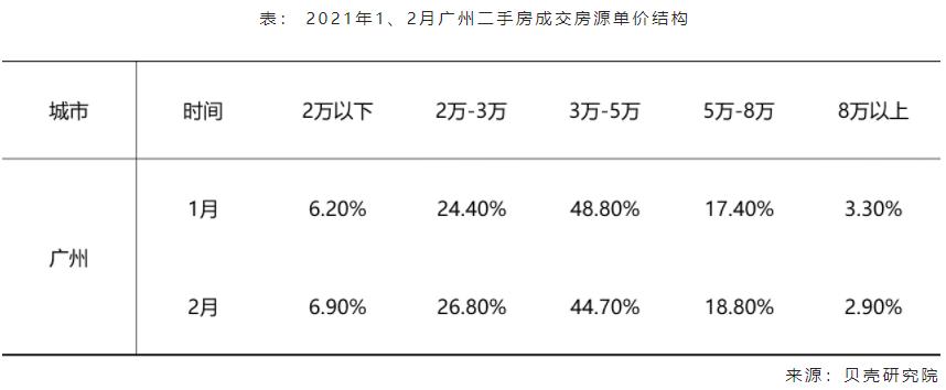 调控后,低总价刚需房源交易量占比提升,高总价房源占比下降。2月北京成交房源中,单价在5万以下房源成交占比较1月提高4个百分点;单价5万以上的房源占比均下降。广州2月单价在3万以下的房源成交占比较1月提高3个百分点。