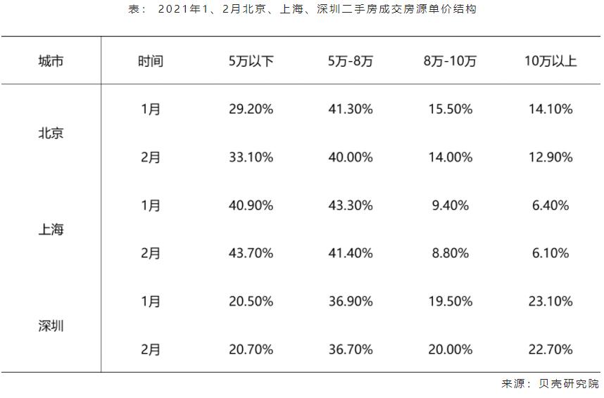 1月下旬以来,一线城市调控收紧政策密集出台,调控氛围紧张,购房者加快入市,春节后上海、北京、广州二手房成交量恢复常态,深圳保持低位。2月一线城市低单价、低总价房源成交占比提高,表明刚需客群入市更为积极。预计3月,北上广3城供需两端活跃且市场预期强,量价上行;深圳市场观望情绪浓,成交量保持低位。