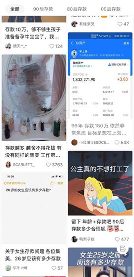 “晒晒你的存款吧,年龄+存款。”在社交平台中,一场关于存款的讨论在90后甚至00后中正在热烈开展。新浪财经在小红书中搜索“存款”字样,可以看到超过五万条相关帖子。帖主往往抛出一个储蓄的话题,例如介绍自身年龄、职业和存款金额,吸引大家交流。