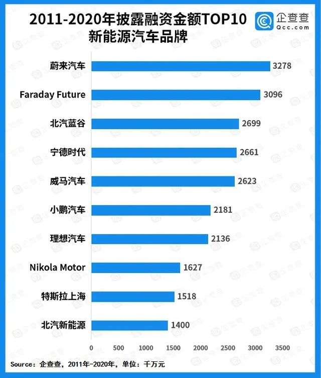 据企查查《近十年新能源汽车投融资数据报告》显示,融资金额的TOP10新能源汽车品牌现融资总额已超过2300亿元。其中,蔚来披露的融资次数达到13次,总融资额达到了327.8亿元,威马、小鹏、理想也都超过了200亿元。