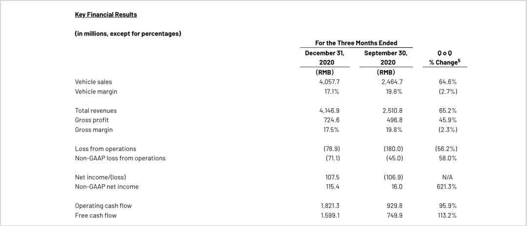 2020年第四季度,理想首次实现季度净利润为正,Q4净利润为1.075亿元人民币,相较2020年Q3季度1.069亿元人民币的净亏损,可以说是云泥之别。同期,蔚来营收约为66.41亿元人民币,同比增长133.2%;净亏损约13.89亿元,同比减少51.5%。