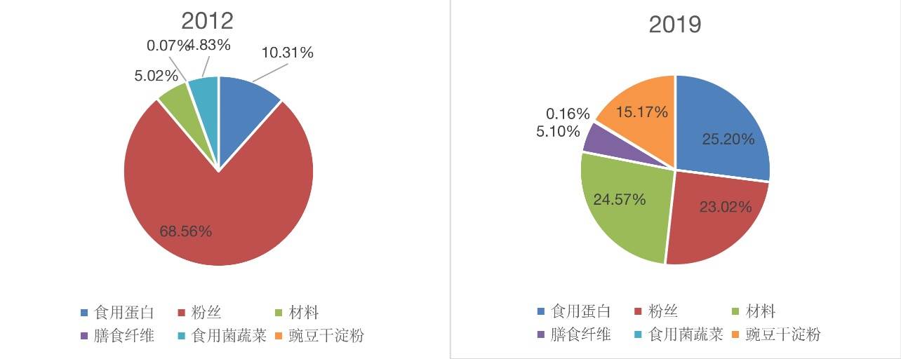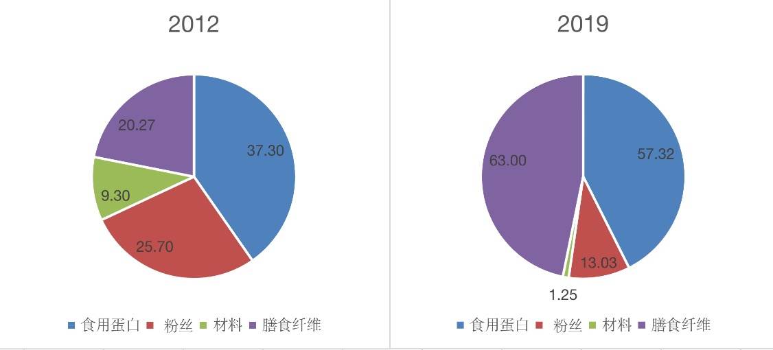 在双塔食品的业务构成中,2019年食用蛋白占总营收的比例为25.21%,膳食纤维占比5%,相比2012 年分别提升了15和5个百分点;相应地,粉丝占总营收的比例为23%,相比2012年的68.56%下降了45个百分点。