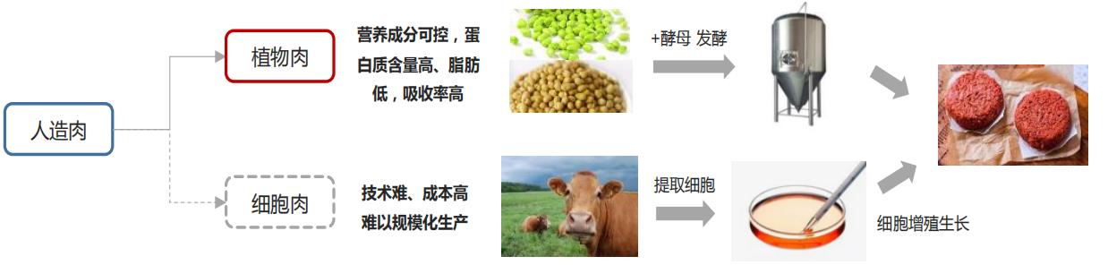 当前市场上的人造肉根据使用的原料及加工工艺不同,可以分为植物肉和细胞肉两个类别。