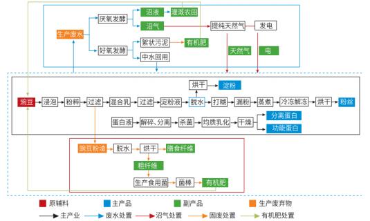 通过最大化挖掘一颗豌豆的价值,双塔最终形成了“粉丝加工—提取食用蛋白、食用纤维—废水沼气提纯—粉渣发展食用菌—菌渣生产有机肥”的“1+10”循环经济产业链条。