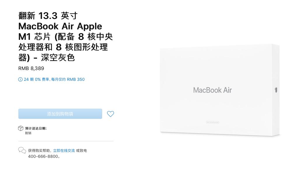 既然性能无法改动,那就只能降低价格了,3月4日,苹果中国就在网上商店上架了一批官方翻新的M1 MacBook Air。与Apple Store销售的「零售版」相比,这批「官翻版」售价普遍要低1000元左右,从价格上来看比拼多多或官网的教育优惠还便宜,甚至能使用官方的24期免息分期,可以说是M1「上车」的最好选择。