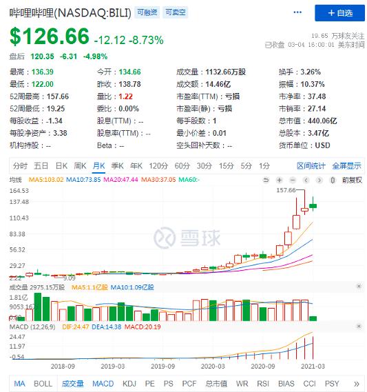 在二级资本市场,在纳斯达克上市后的B站K线图处于指数增长状态。上市之初,B站的市值仅32亿美元,今年2月11日,B站股价达到最高价157.66美元每股,市值超过500亿美元。