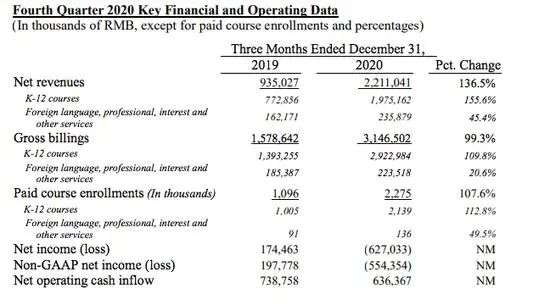 3月5日,跟谁学发布了截至2020年12月31日第四季度和全年未经审计财务报告。