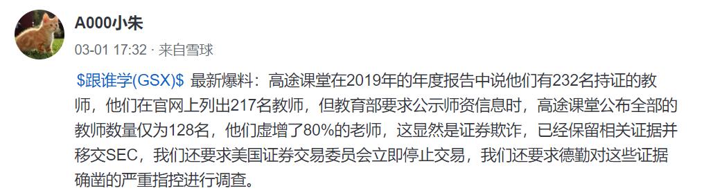 更何况,跟谁学的名师资质正遭受前所未有质疑。近日,有网友在雪球爆料跟谁学旗下高途课堂存在虚增80%的老师、教师资格证造假、无证老师悄悄上课等问题。消息传开,这周三美股收盘,跟谁学股价暴跌11.59%。跟谁学虽然对此分别进行了相应回应,但真相究竟如何,还有待相关机构和时间的检验。
