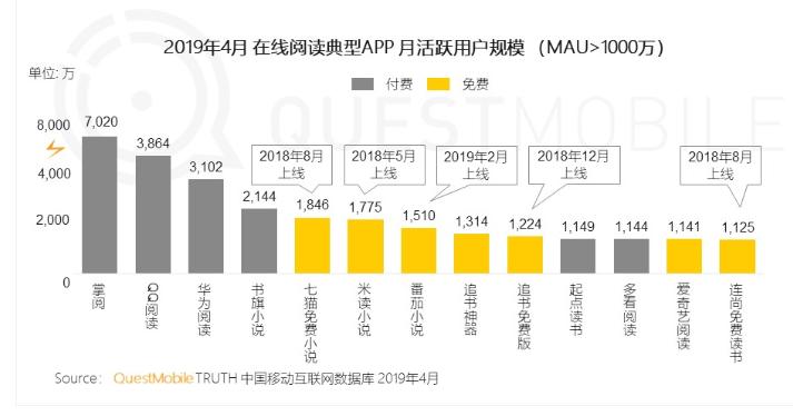 然而,盯上这一市场的企业并非趣头条一家。其中字节跳动推出番茄小说,还投资了塔读文学、闻秀科技等;巨头百度也亲自下场,既付费市场推出纵横中文网后,在免费阅读市场推出七猫小说,并且战略投资中文在线;面对免费市场的空间,已经掌握了付费市场大半江山的阅文集团推出了飞读,战略投资了中文在线。根据数据统计,虽然米读行动更早,但是后续出现在市面上免费阅读应用已经跟上了米读的脚步,甚至七猫已经小说的活跃用户已经超过了米读。