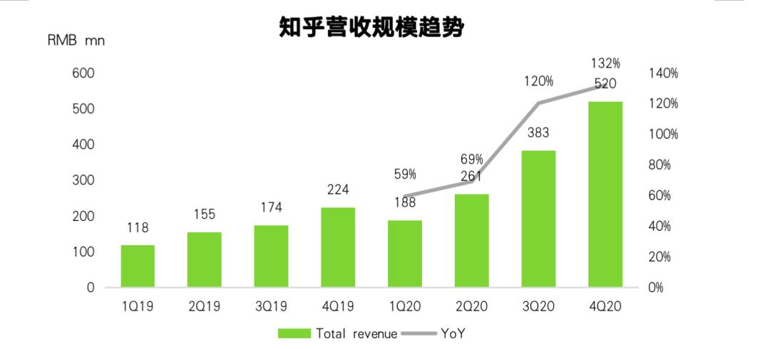 分开每个季度来看,我们可以发现,知乎的营收增速正在不断攀升,2020年第一季度至第四季度总营收增速由59%提升至132%,这与知乎不断扩张的商业化版图息息相关。