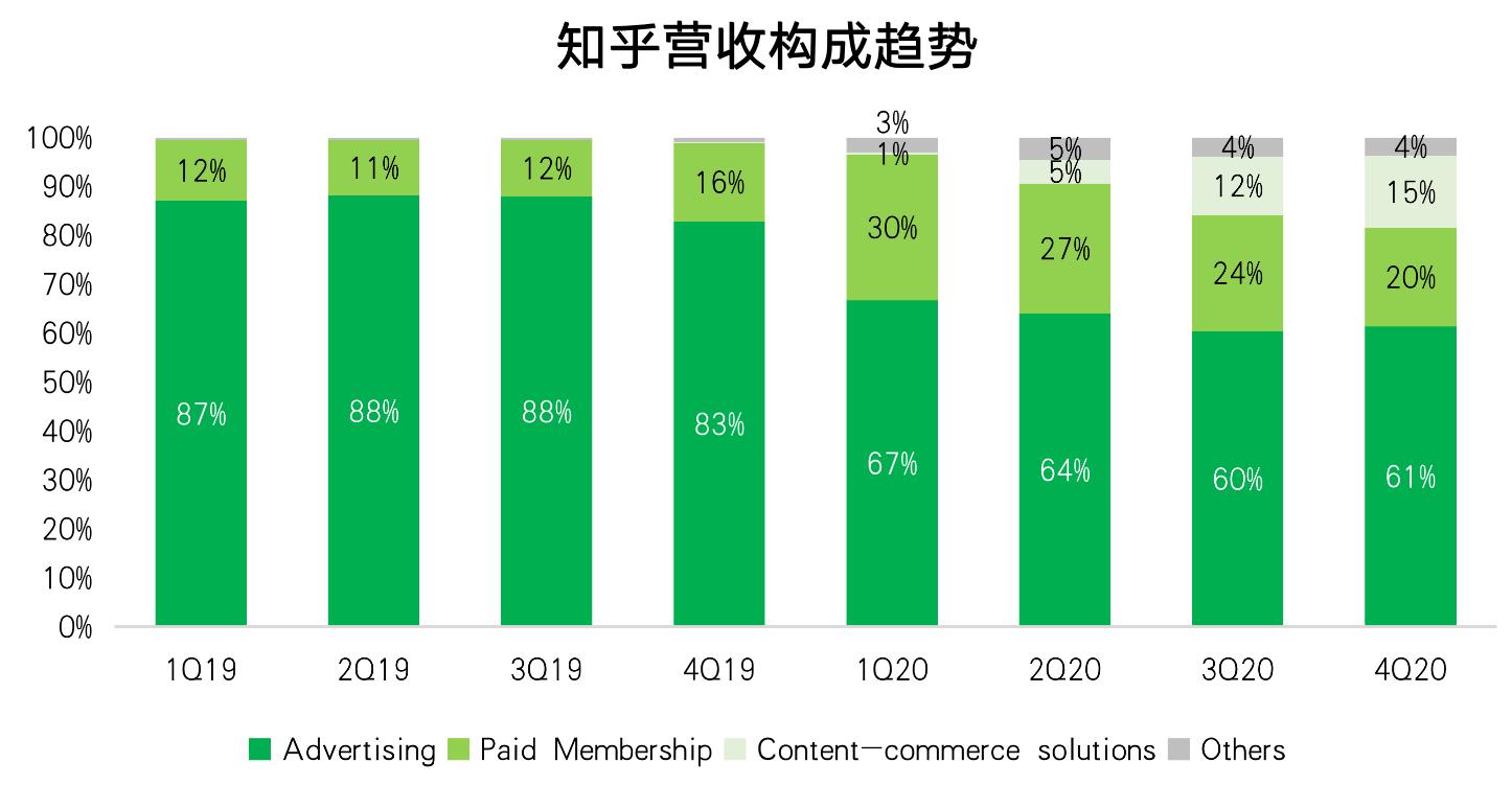 此外,知乎于2020年初推出的商业内容解决方案自开始至今的表现也惹人注意,全年收入达到1.36亿,虽然起步较晚,但其应收贡献却从1Q20的1%快速增长至4Q20的15%。