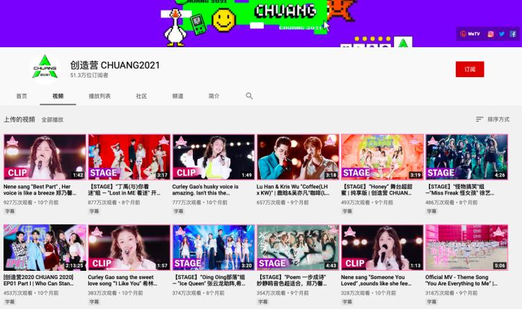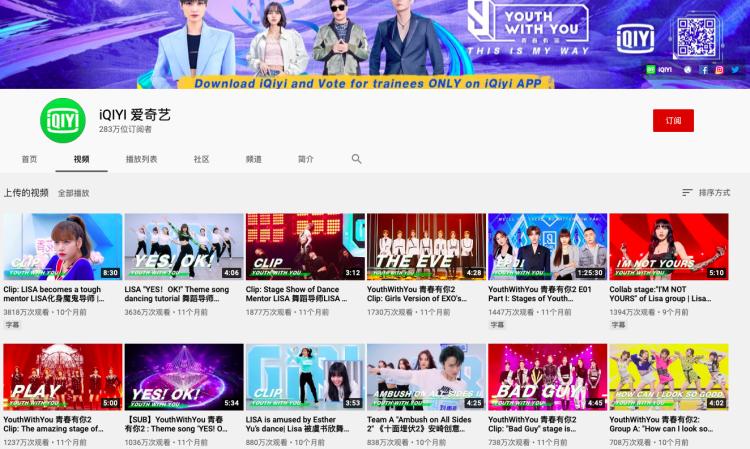 其实不管是《青春有你》还是《创造营》,能获得这么多外国观众的关注不是偶然,视频平台自己就在花大力气推动这件事。就比如在两家作为海外社交宣传主阵地的YouTube,除了上线多语言字幕等等最基本的工作外,爱奇艺和腾讯视频都各自在面向不同国家的子账号主页上传了节目视频,还把子账号的封面图都换成了节目海报。