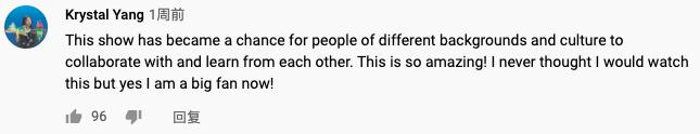 除了是某些选手和导师的粉丝,外国观众中是节目粉的也不在少数。比如有创4的观众评价说,“这个节目对有不同背景和文化的人来说是一次团结在一起并相互学习的机会,这太神奇了!我从来没想到自己会看这档节目,但是的,我现在成了这节目的超级粉丝!”